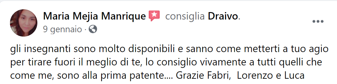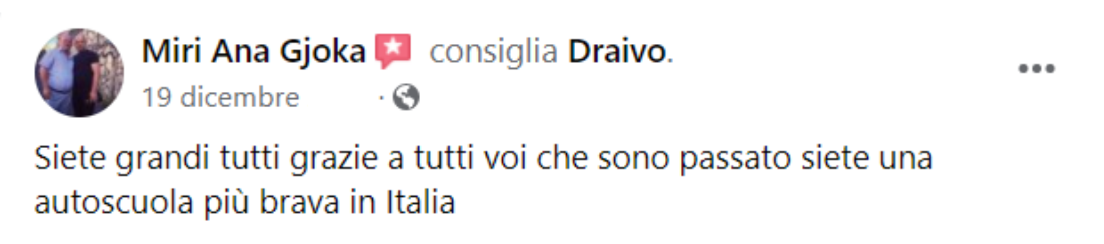 "Prima di iscrivermi, vedevo le pubblicità di Draivo su Facebook e Instagram, ma non ero ancora molto convinto. Alla fine un mio amico mi ha consigliato di iscrivermi all’autoscuola Draivo, perché anche lui si era iscritto e si era trovato bene.